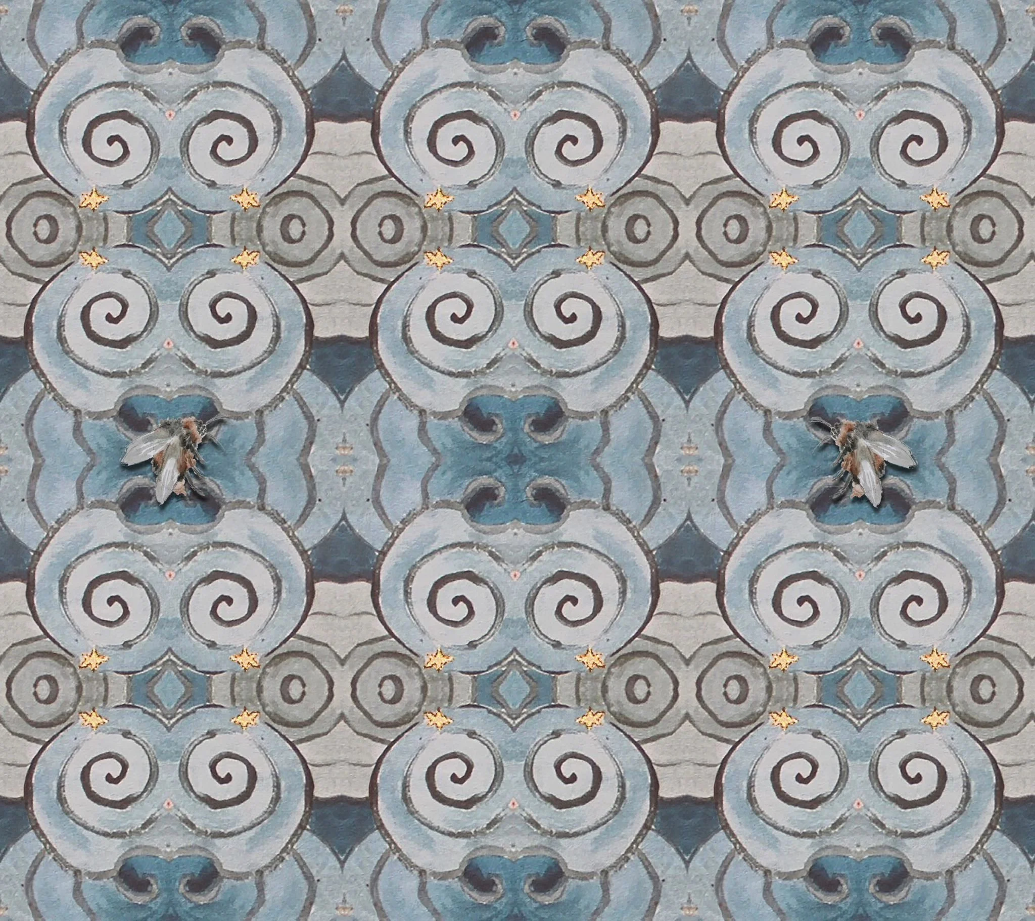 I always love a vintage wallpaper with small repeats and patterns, here I have taken some of my passion for this style of design and recreated a dreamy swirl repeat, keeping the tones and mark making from the paint, with added hand pained bees to add character and fun.